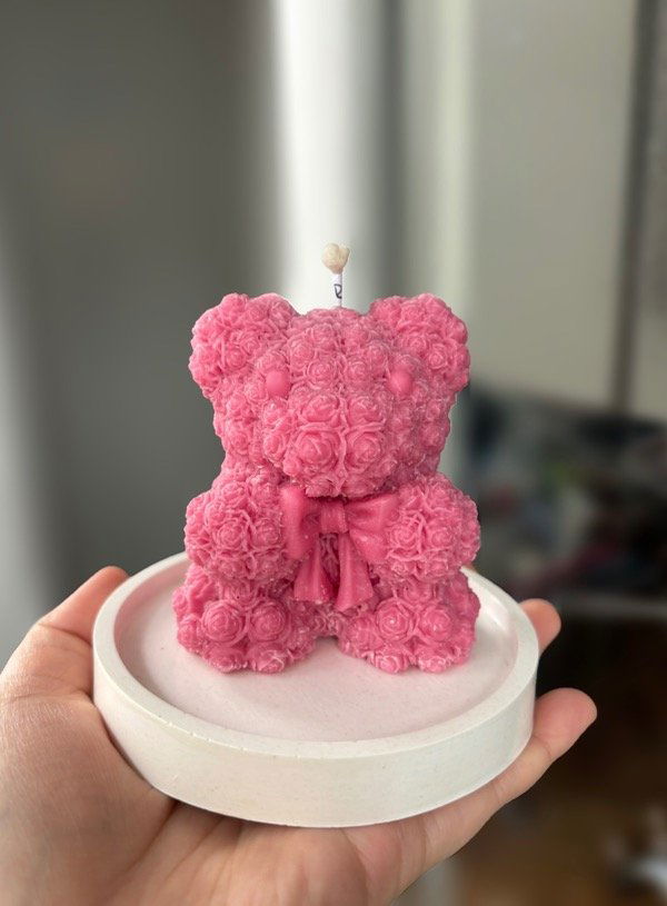 Nuestra Vela Teddy cubierta por pequeñas rosas esta elaborada con cera de soja 100% natural y 10% de esencia para un aroma suave y duradero. Su diseño romántico y encantador la convierte en el regalo perfecto para sorprender o decorar con un toque especial. Disponible en todos los colores (especificar color al realizar la compra).