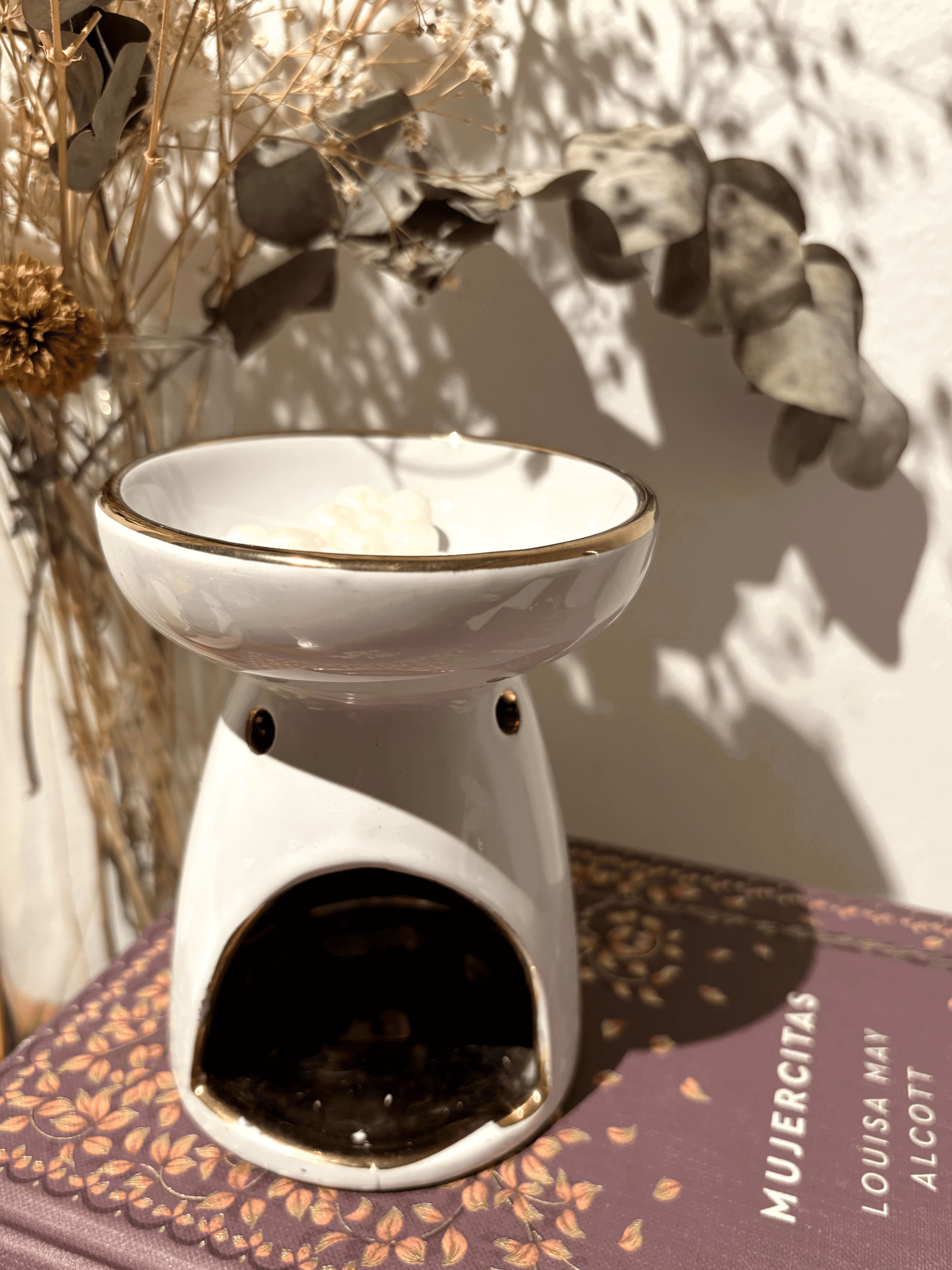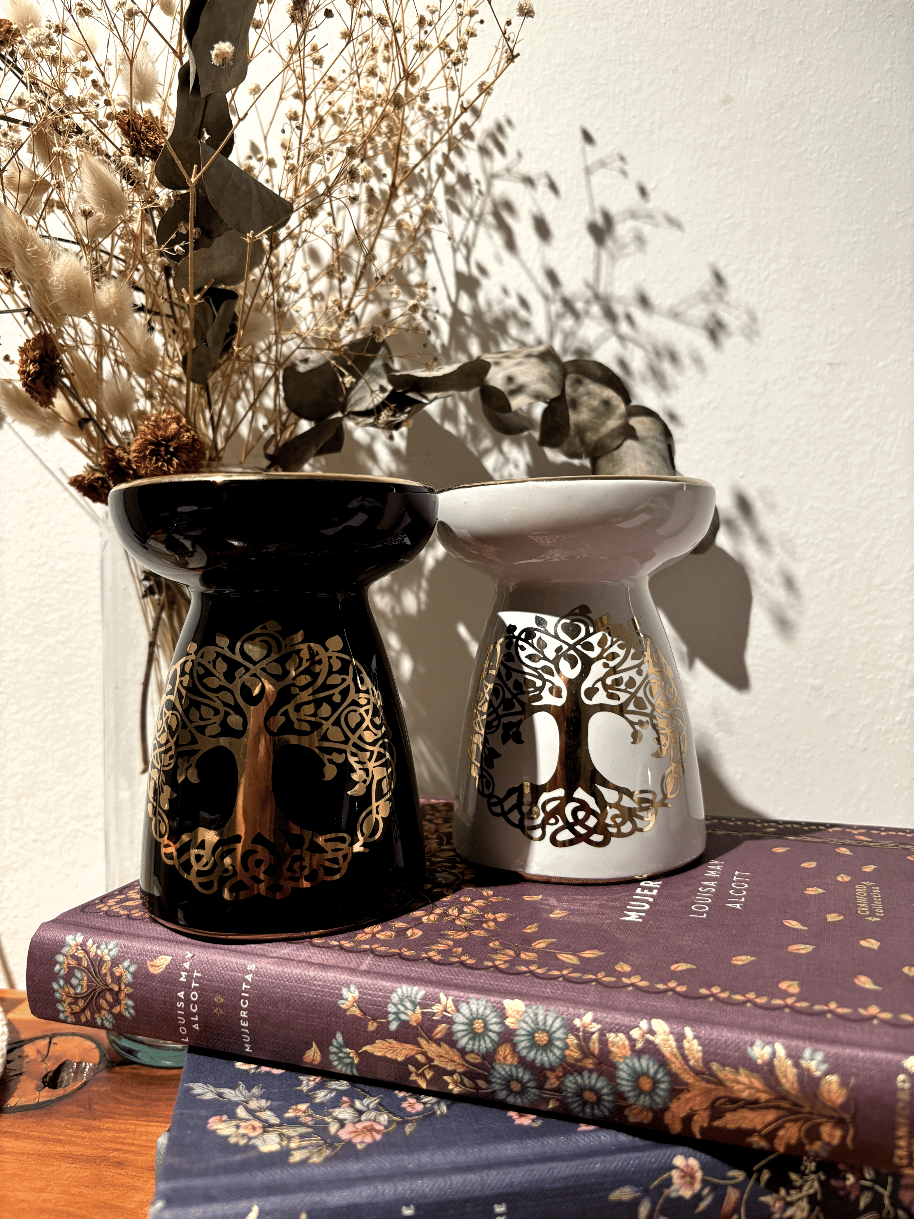 Hornito aromático alto disponible en color negro o blanco, decorado con un delicado diseño dorado del Árbol de la Vida. Ideal para acompañar velas de noche y esencias, creando un ambiente cálido y perfumado mientras aporta un toque de espiritualidad y elegancia a tu espacio. Su diseño lo convierte en una pieza decorativa única, perfecta para realzar cualquier rincón.