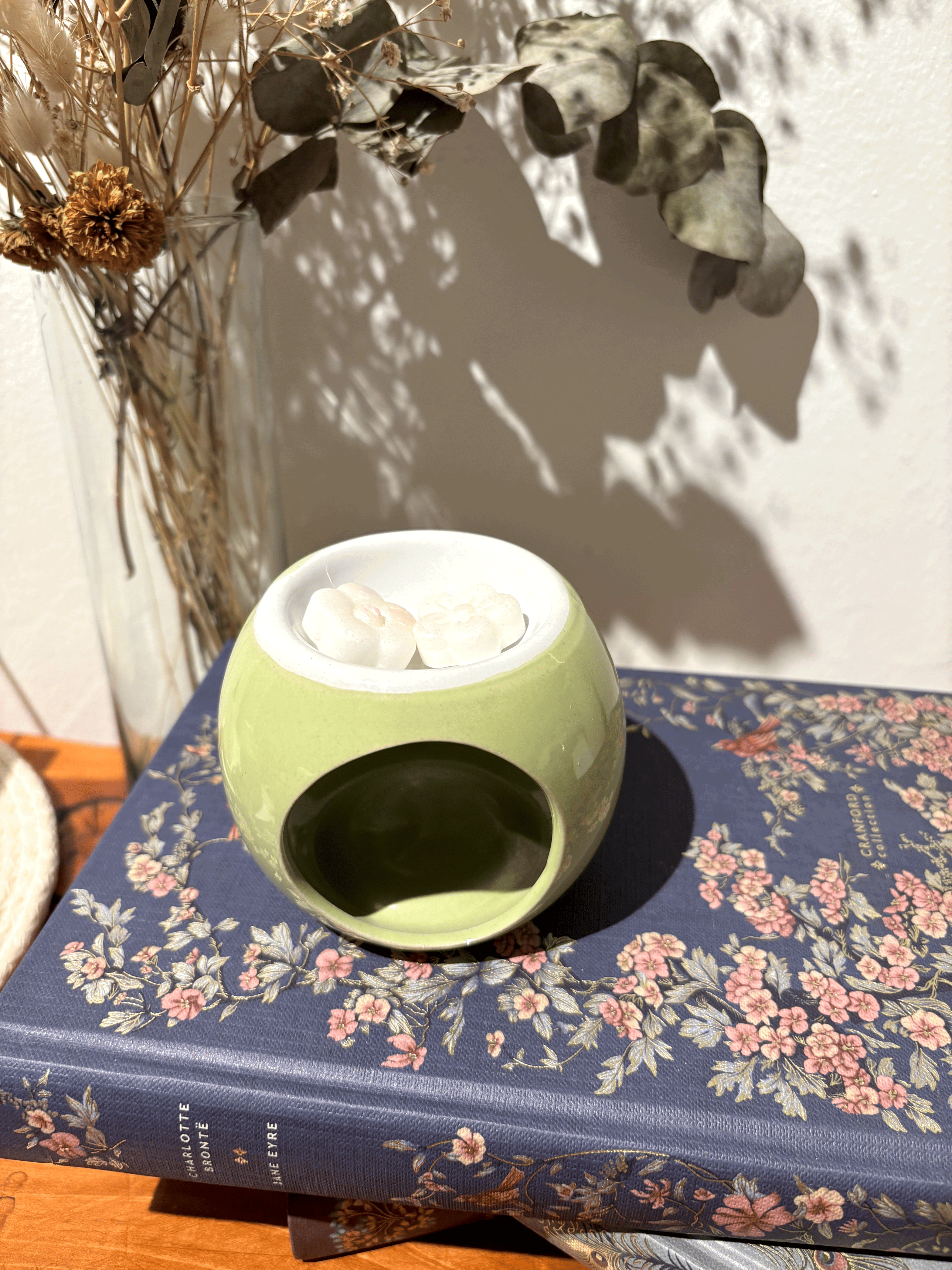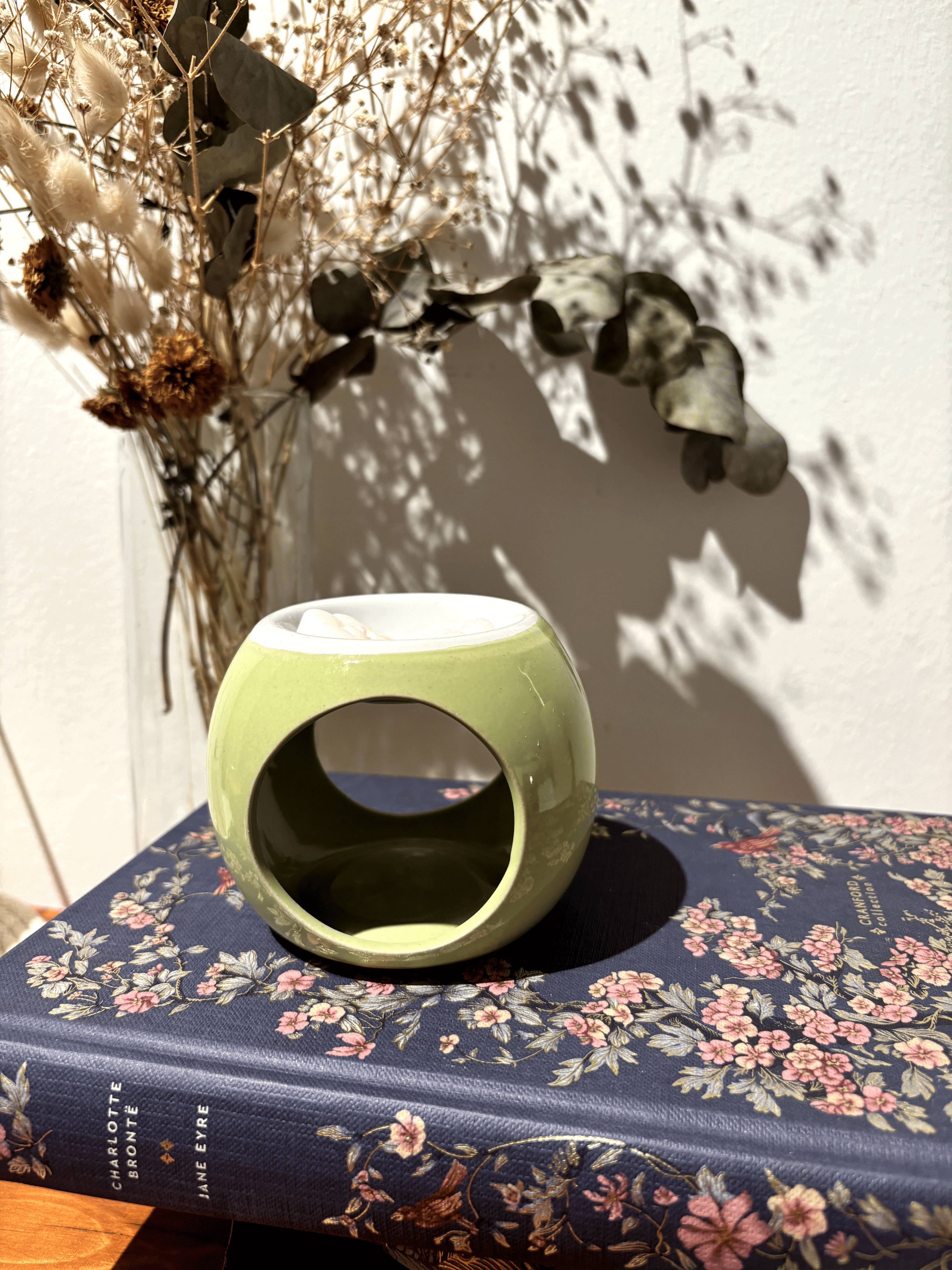 Hornito aromático redondo en color verde manzana, con ventana central que aporta un detalle decorativo y permite ver la luz de la vela en su interior. Ideal para usar con esencias o velas de noche, creando un ambiente cálido y perfumado en tu hogar. Su diseño combina practicidad con un estilo moderno y delicado.