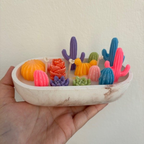 Nuestra Vela Garden está hecha en maceta ovalada de resina acrílica, rellena con cera de soja 100% natural y esencias puras y concentradas para un aroma intenso. Su decoración con cactus le da un toque único, ideal para ambientar cualquier espacio con estilo y calidez. Color de los cactus y de la maceta a elección, aclarar al realizar la compra.