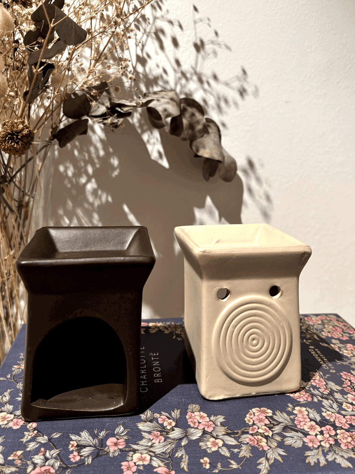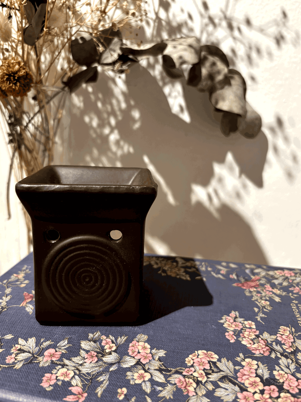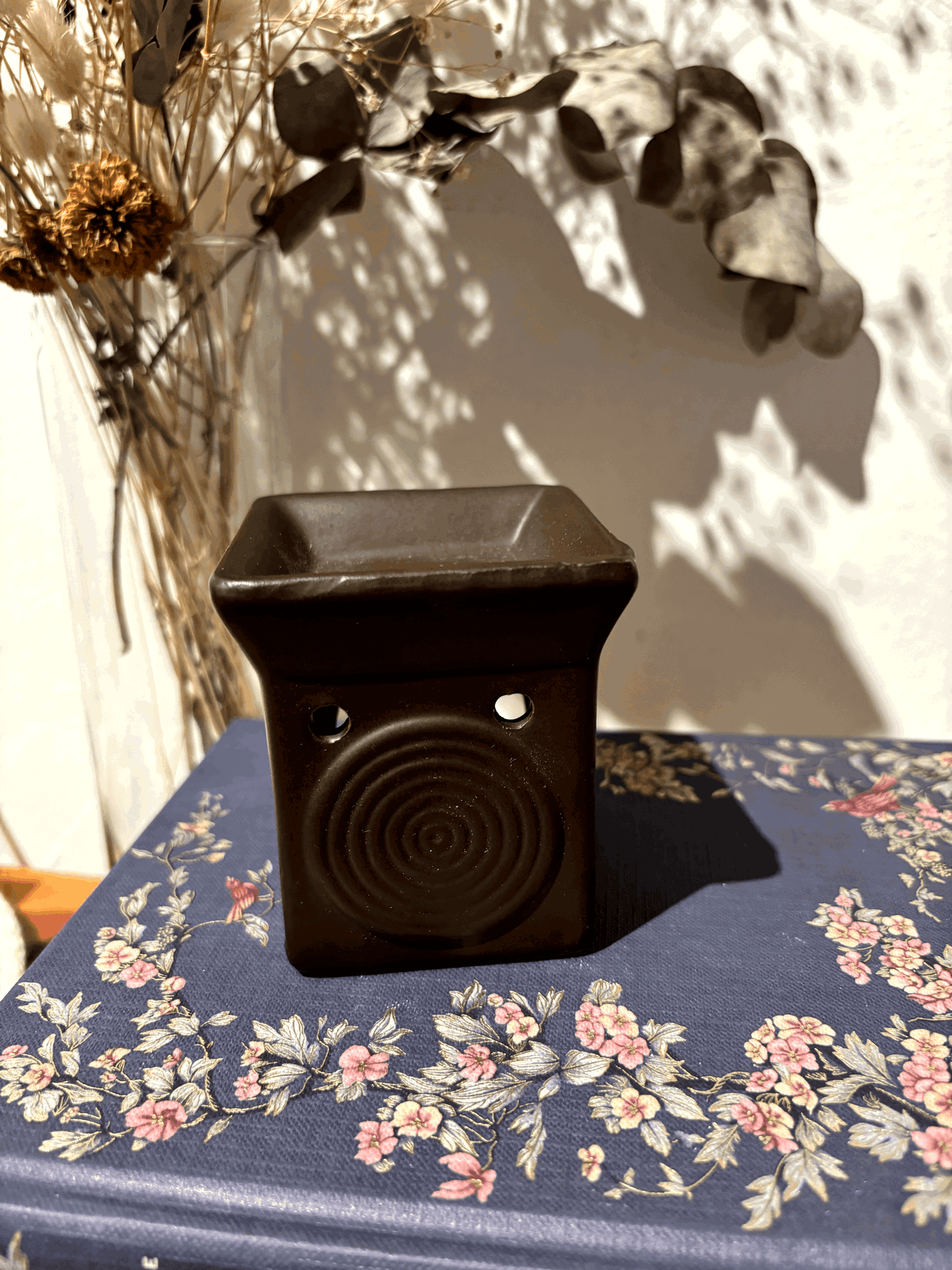 Hornito aromático cuadrado con diseño de espiral, ideal para usar con velas de noche y esencias aromáticas. Su forma geométrica y el detalle del dibujo lo convierten en una pieza decorativa única que aporta estilo y calidez a cualquier espacio, a la vez que perfuma el ambiente de manera delicada.
