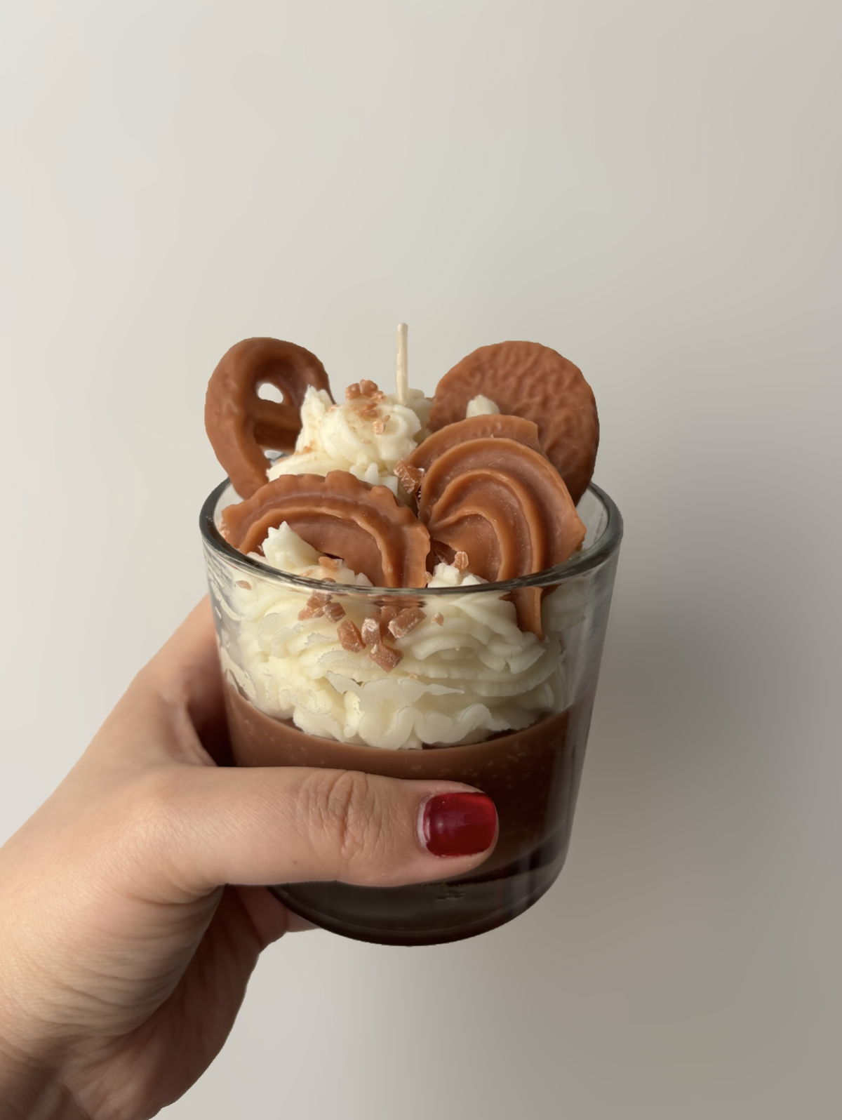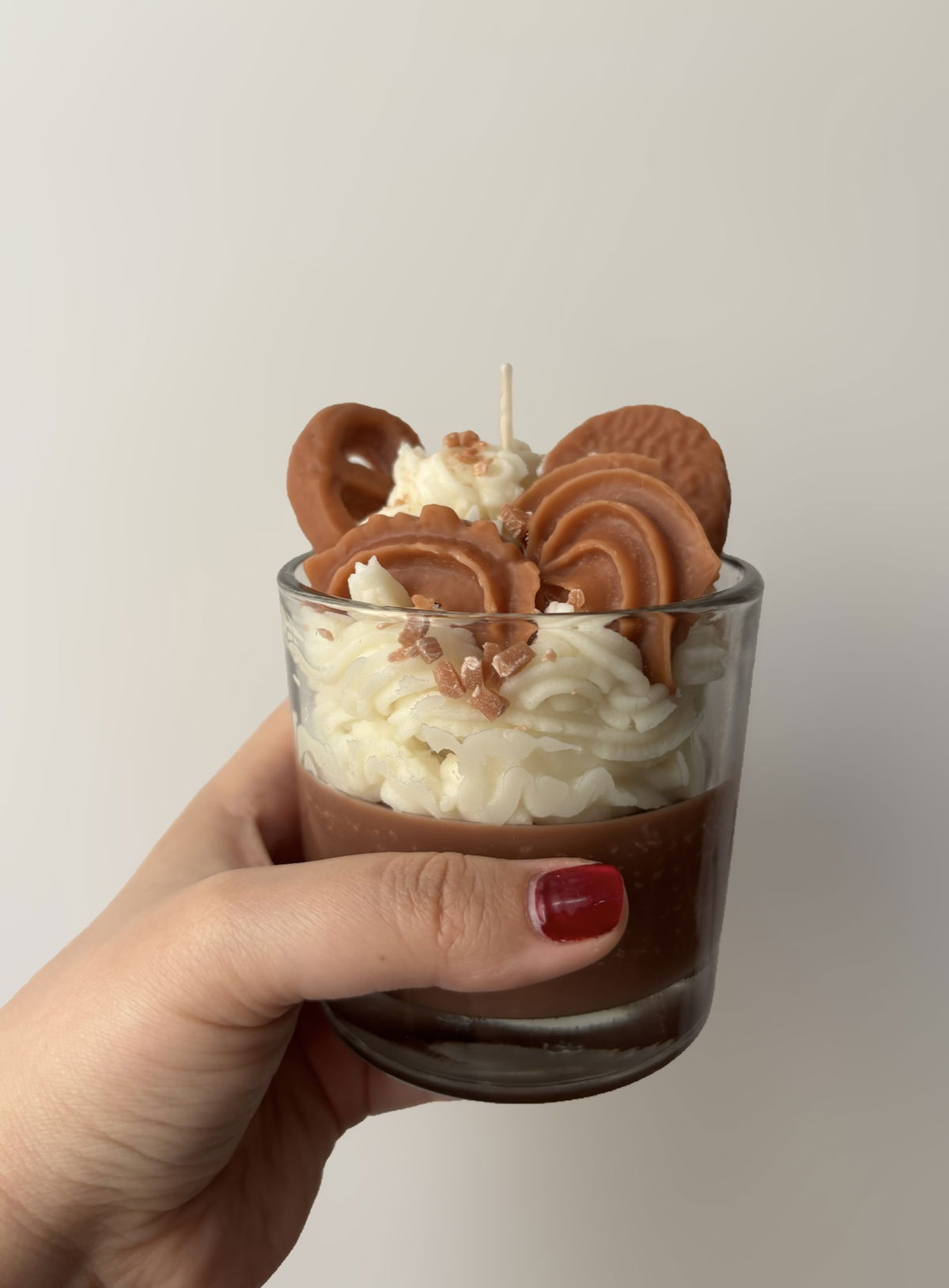 Una delicia a la vista y al olfato. Nuestra vela en vaso XL con diseño de cookies & crema chantilly es una pieza artesanal pensada para quienes aman los aromas dulces y los detalles visuales que enamoran. Su presentación simula un postre irresistible, con capas que imitan galletas de chocolate, crema suave y un topping de chantilly decorado con esmero.