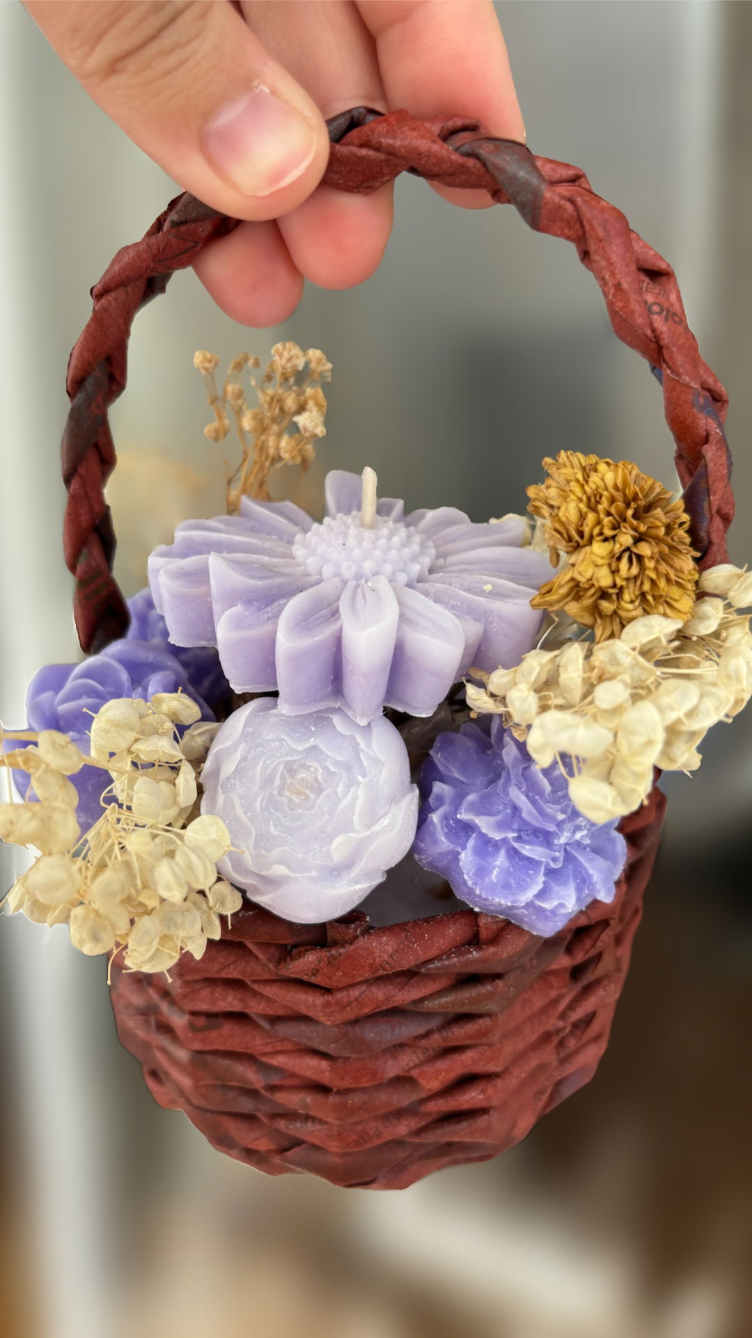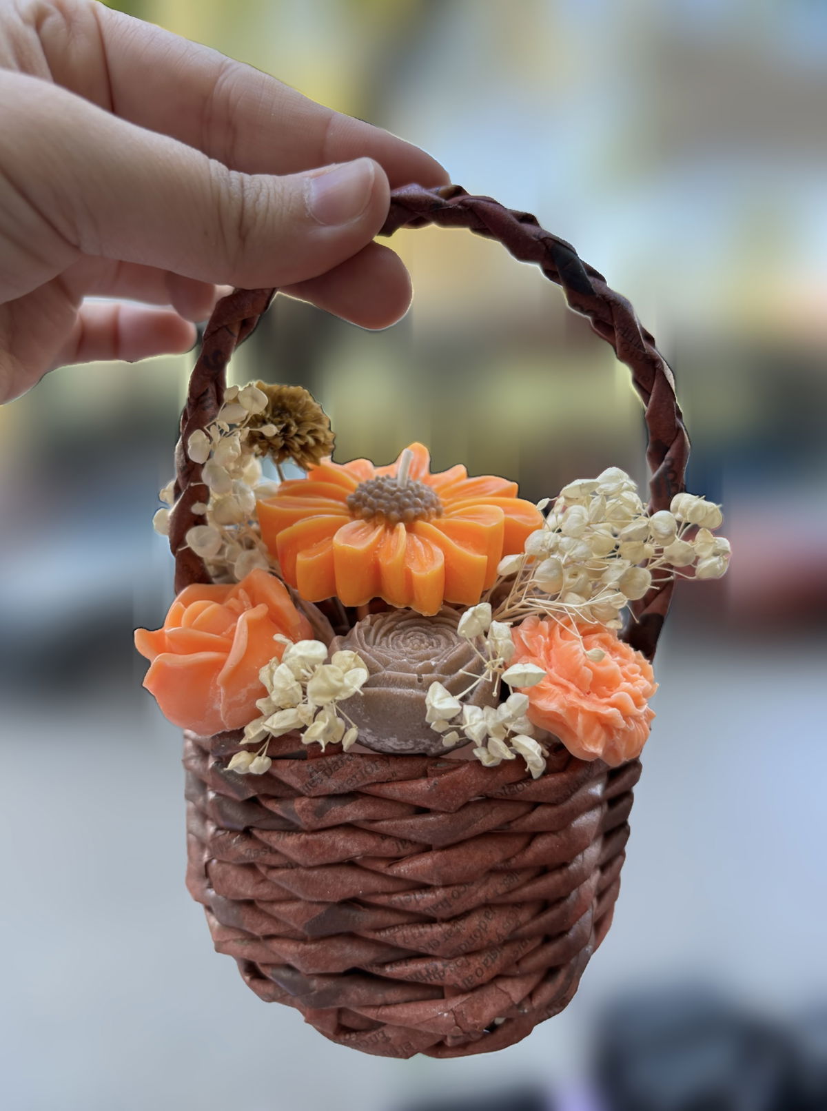 Nuestra Canasta Bouquet reúne 7 wax melts artesanales de cera de soja (bombones aromáticos) y 1 vela margarita, perfumados con esencia pura al 10% para asegurar una fragancia profunda, duradera y envolvente.
